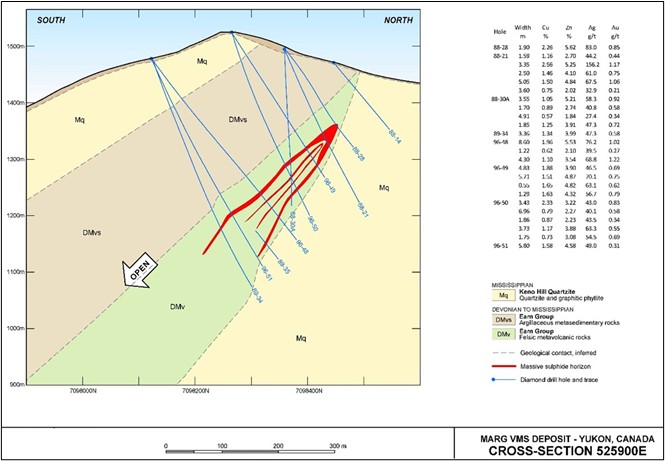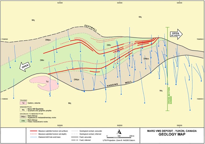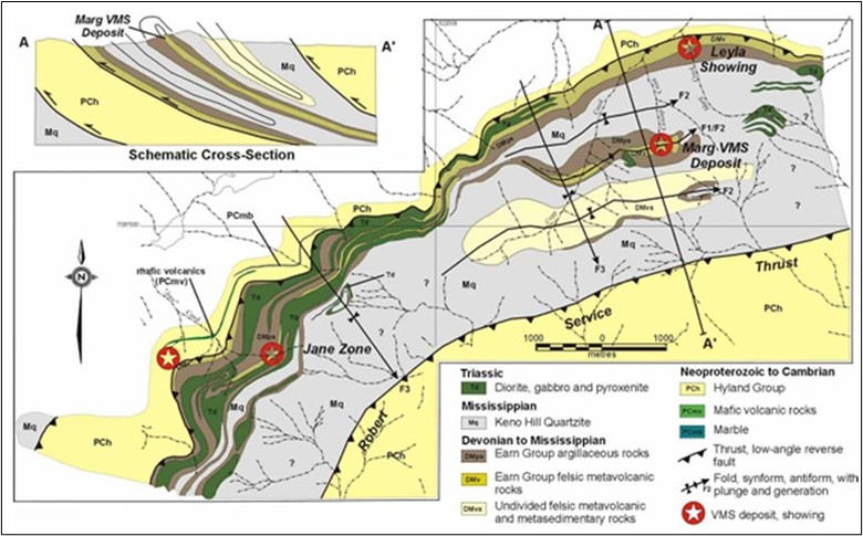 The Marg deposit is located towards the northwestern part of the Marg property and is hosted within a 12 km belt of felsic volcanic rocks belonging to the Devono-Mississippian Earn Group (Figure 2).