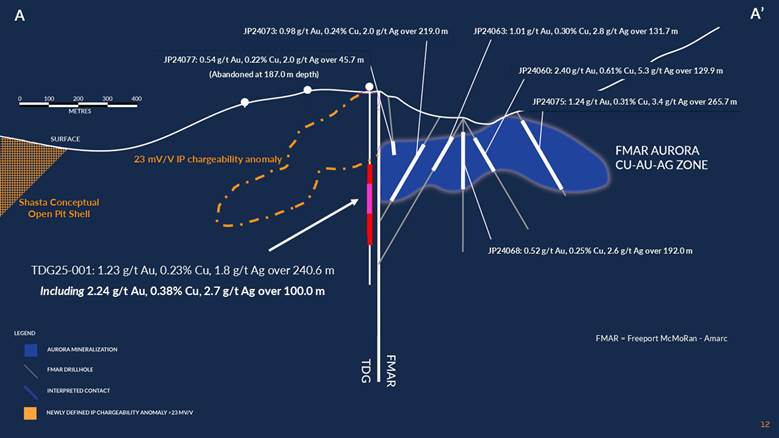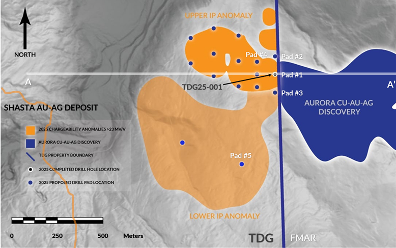 In 2023, TDG defined the 5.5 sq.km Greater Shasta-Newberry exploration target area (news release Jan 25, 2023) which is located directly adjacent to the gold-rich copper porphyry AuRORA1 discovery announced by Freeport McMoran Inc. and Amarc Resources Ltd. (news release Jan 17, 2025).